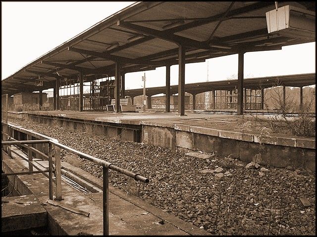 *) Blick vom Stellwerk zum Bahnsteig. Hier gibt es eine Treppe auf den Bahndamm.